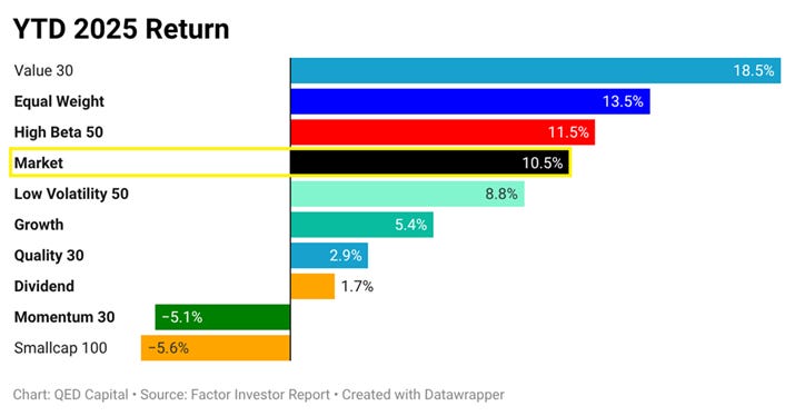 •Quality & Low Volatility: Protection over participation. Defensive factors did what they were meant to do—limit damage during drawdowns but lagged during rebounds.